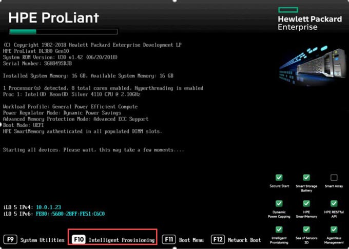 Để bắt đầu cấu hình iLO, khi khởi động máy chủ, bạn hãy nhấn phím F10 tại màn hình POST để truy cập vào giao diện Intelligent Provisioning.