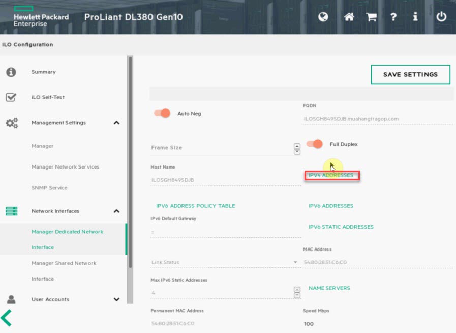Tại giao diện cấu hình iLO, truy cập vào mục Network Interfaces, sau đó chọn Manage Dedicated Network Interface. Tiếp theo, chọn IPv4 Addresses để mở cửa sổ cấu hình địa chỉ IPv4.