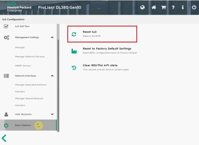 Chọn Reset Options → Reset iLO, sau đó nhấn OK để hệ thống khởi động lại và áp dụng cấu hình mới.