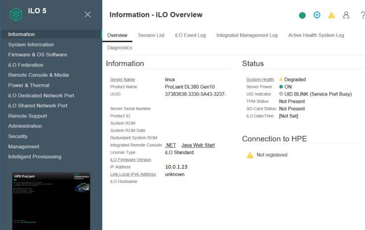 Sau khi đăng nhập thành công, bạn sẽ truy cập vào giao diện web của iLO.Tại đây, bạn có thể thực hiện nhiều tác vụ quản trị như: giám sát tình trạng phần cứng, cài đặt hệ điều hành từ xa thông qua hình ảnh ISO, quản lý nguồn, theo dõi log hệ thống và nhiều chức năng quản lý khác.
