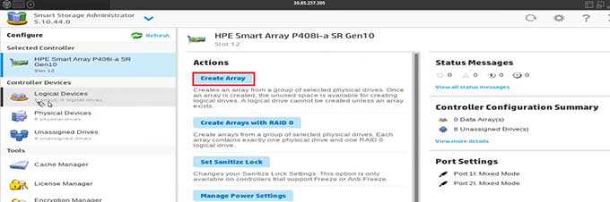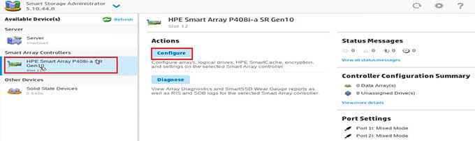 Bước 4: Tại giao diện Smart Storage Administrator, lựa chọn card HPE Smart Array P408i-p SR Gen 10 và chọn Configure để bắt đầu cấu hình.