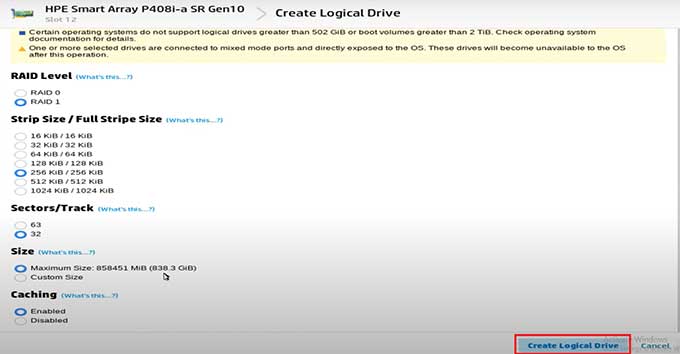 Bước 6: Tại màn hình Create Logical Drive, lựa chọn Raid level và các thông số tùy chỉnh sau đó bấm Create Logical Drive.