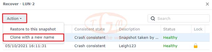 - DSM 6.2 trở xuống: Vào iSCSI Manager → Snapshot.