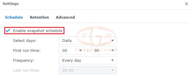 Thiết lập lịch trình: Chuyển sang tab Schedule, tích chọn Enable snapshot schedule, thiết lập thời gian và tần suất để tự động chụp snapshot, hoặc bỏ chọn hộp nếu muốn hủy lịch trình.