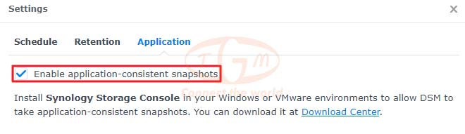 Application-consistent: Khi chụp snapshot ở trạng thái này, các ứng dụng sẽ flush toàn bộ dữ liệu xuống LUN, đảm bảo consistency của dữ liệu ứng dụng. Snapshot ở trạng thái này chỉ có thể thực hiện khi Synology Storage Console đã được cài đặt trên máy Windows hoặc máy chủ VMware vCenter, tùy môi trường hoạt động.
