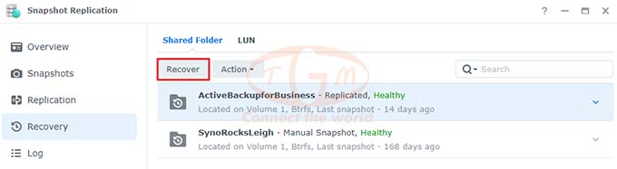 Trong Snapshot Replication > Recovery , bạn có thể khôi phục thư mục dùng chung hoặc dữ liệu ảnh chụp nhanh LUN.